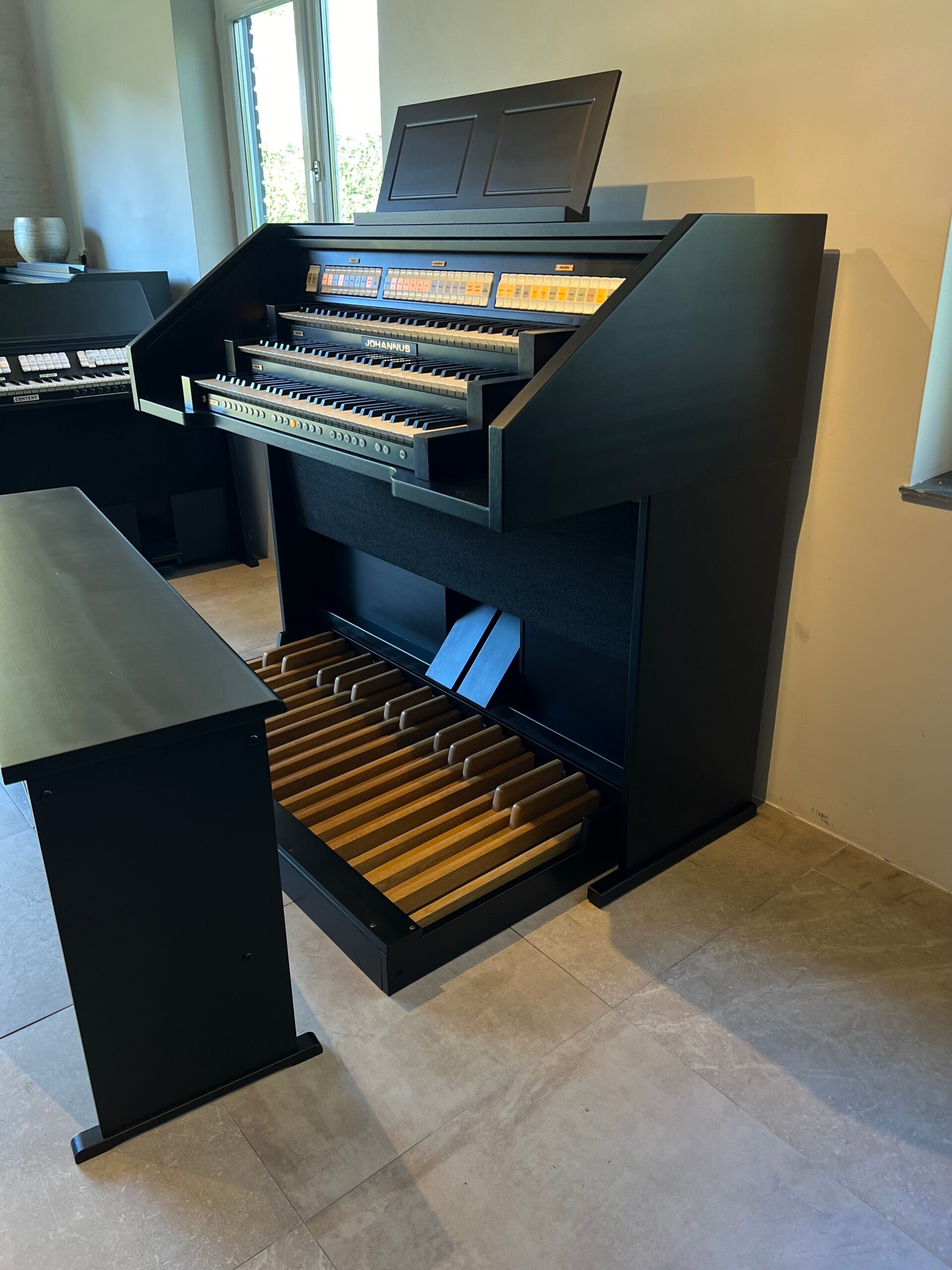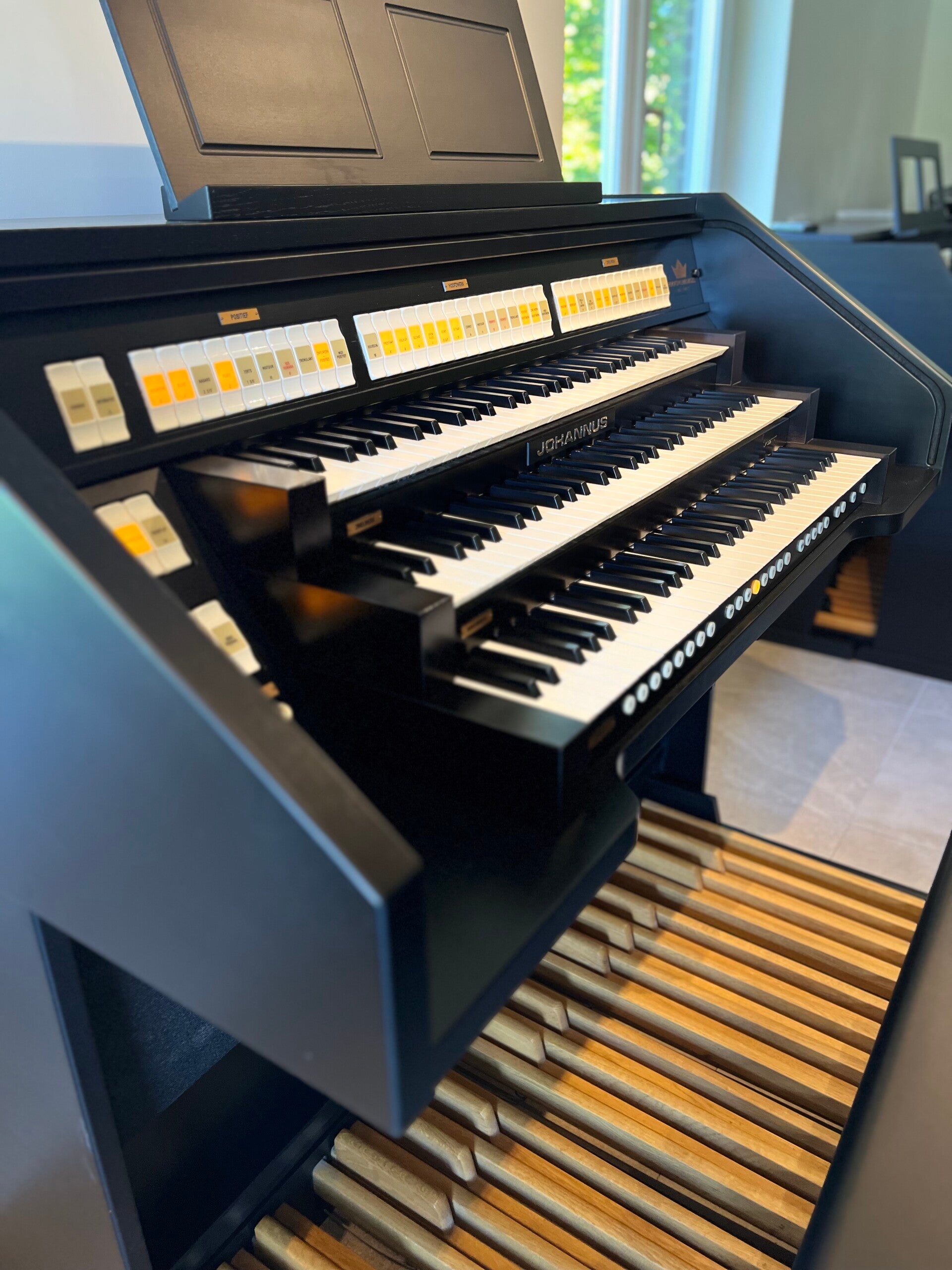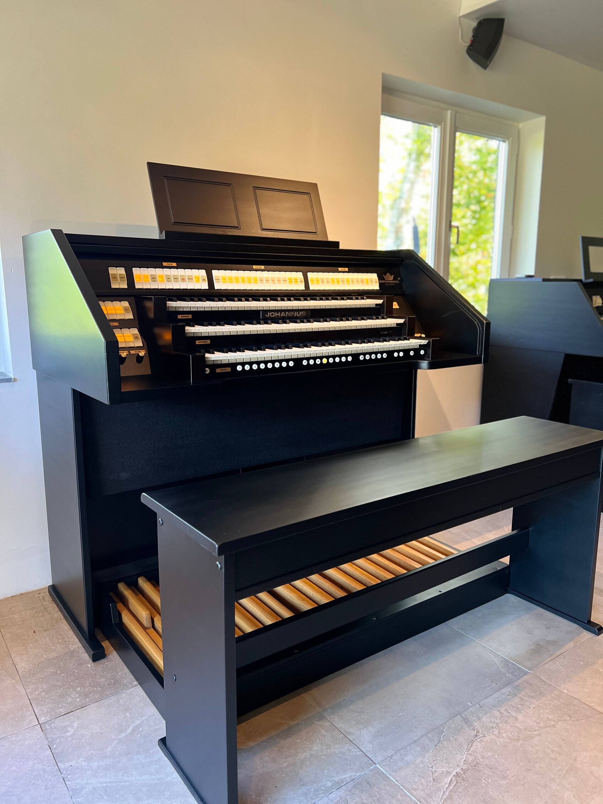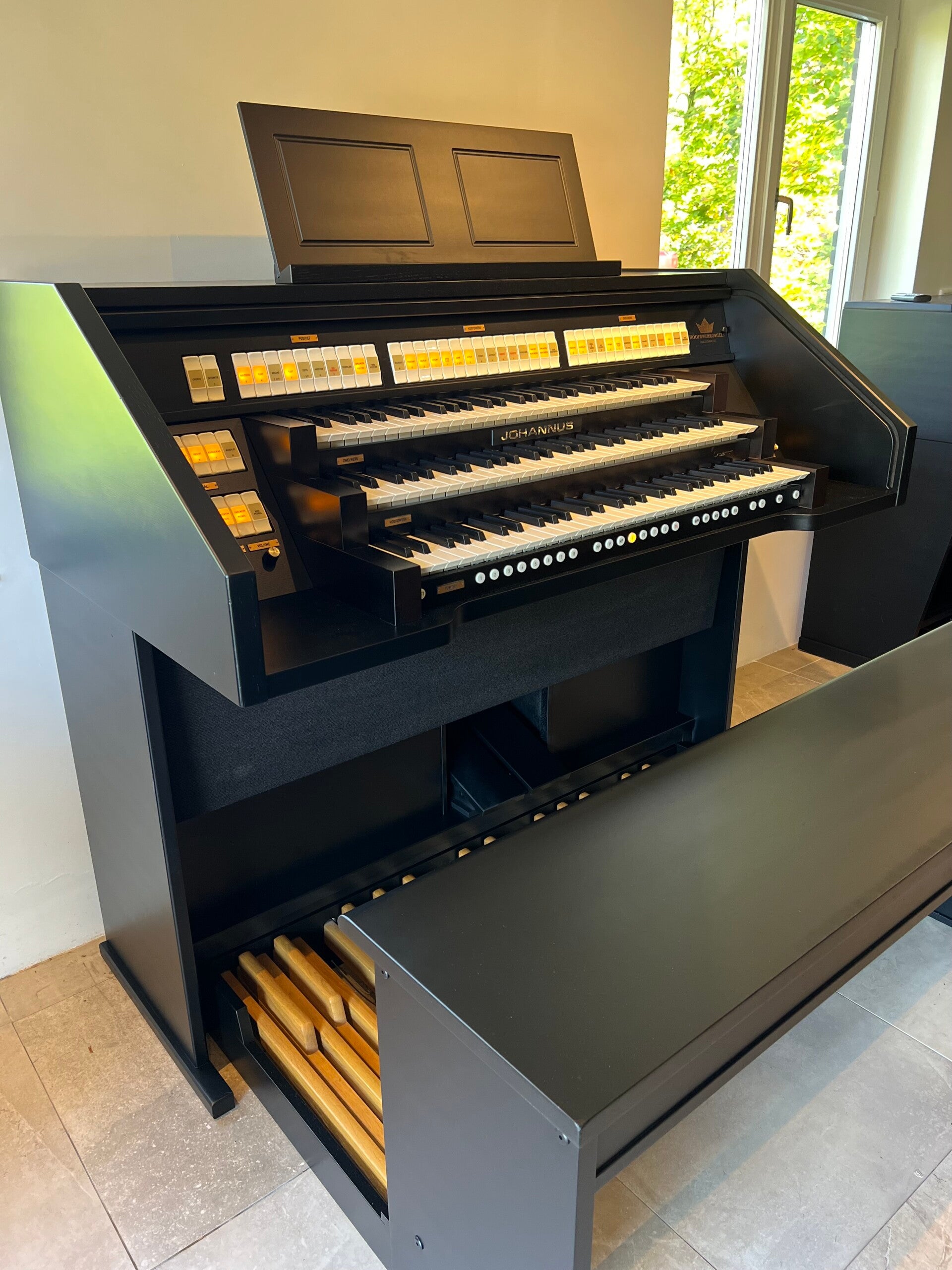 Het drie-klaviers orgel in zwart op eiken uitvoering, met 38 romantische en 38 barok digitaal gesampelde stemmen.